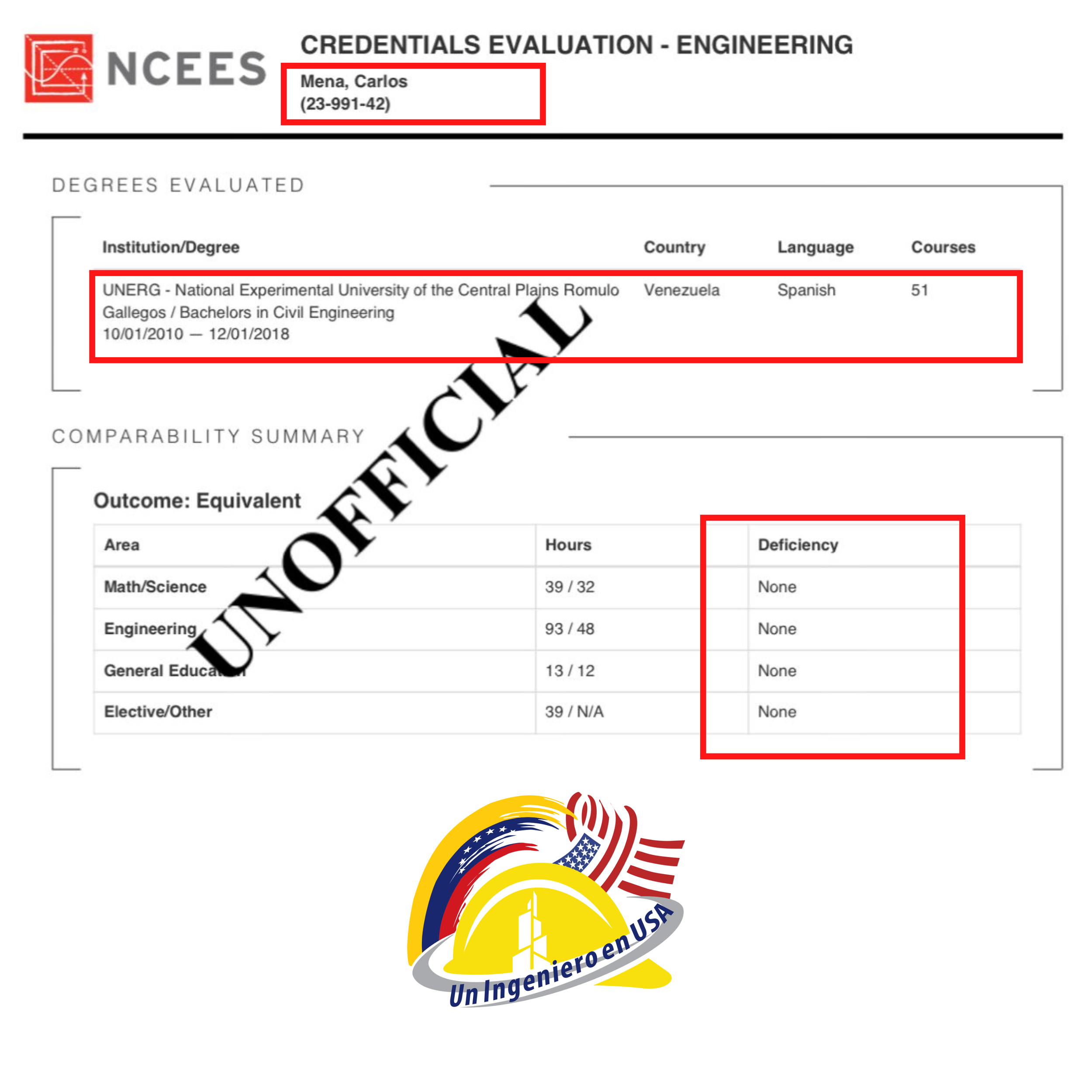 “He adquirido los servicios de reválida e información del FE con Oscar y no me queda más que agradecerle por todo el esfuerzo, tutoría y guía en el proceso para poder obtener el Credential Evaluation Certification por parte de NCEES sin ninguna deficiencia en tan solo 2 meses. Ahora, se me han abierto más las posibilidades de poder ejercer como Ingeniero Civil en Estados Unidos ya que a pesar de no contar aún con la certificación del ElT, puedo añadir y mostrar en mi Curriculum que cuento con la convalidación de mis estudios y así demostrar a los empleadores que soy un profesional avalado por una entidad acreditada en los Estados Unidos y que me encuentro en proceso eventual de adquirir el ElT.